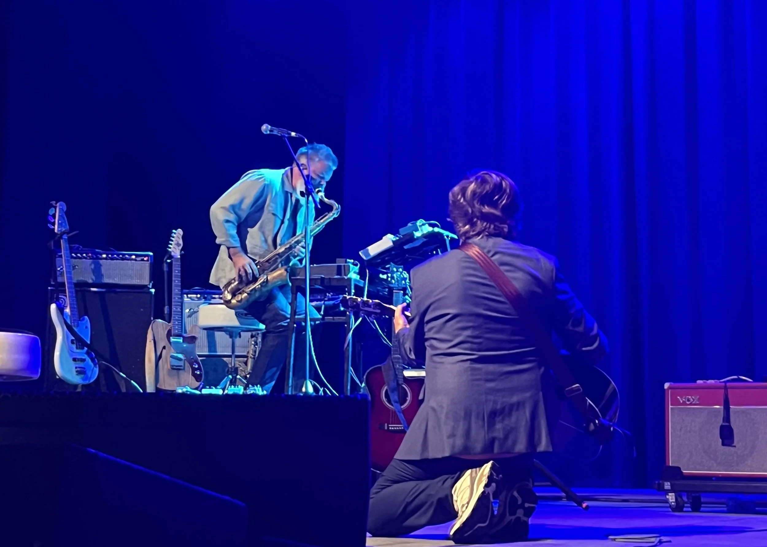 John Darnielle kneeling to Matt Douglass’s saxophone during “Bones Don’t Rust”